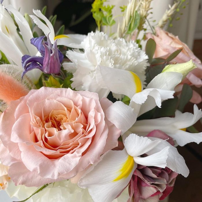 Роза персиковая – 2 шт.Диантус – 4 шт.Клематис – 1 шт.Ирис – 2 шт.Буплерум – 1 шт.Лагурус – 2 шт.овес сухоцвет – 2 шт.Эвкалипт – 1 шт.Коробка шляпная – 1 шт.Губка флористическая – 1 шт.