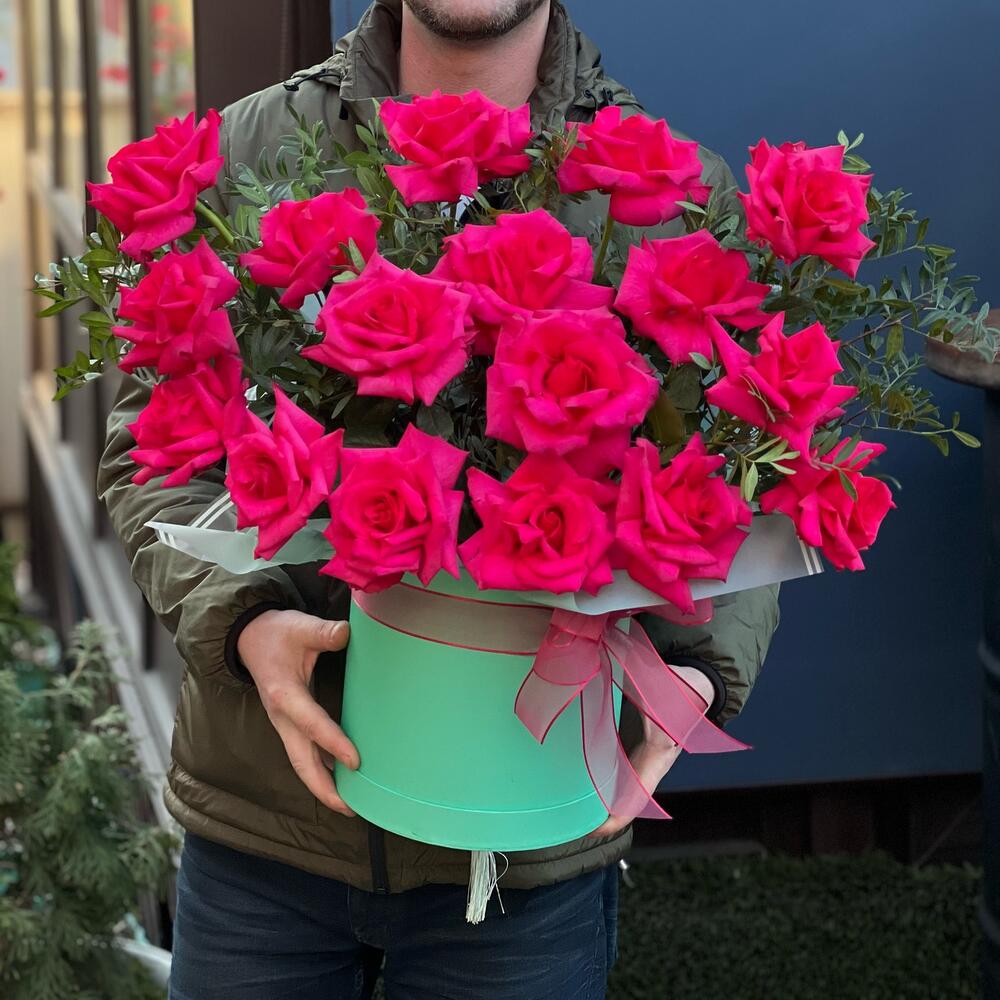 Роскошная композиция из малиновых роз в шляпной коробке удобный и практичный подарок на любой праздник для ваших близких