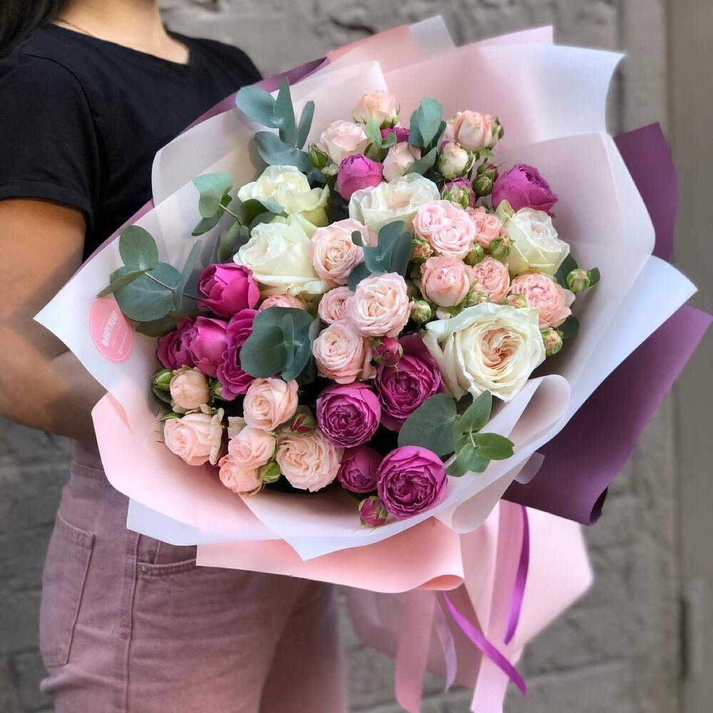 роза кустовая пионовидная misty bubbles – 5 шт.роза кустовая пионовидная bombastic – 9 шт.роза одноголовая пионовидная white o’hara – 5 шт.Зелень – 4 шт.Упаковка дизайнерская – 3 шт.
