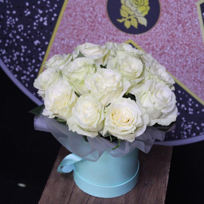 Роза Мондиаль – 15 шт.Пленка дизайнерская – 1 шт.Оазис флористический – 1 шт.Коробка шляпная – 1 шт.