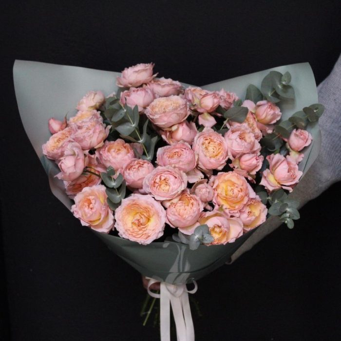 Эвкалипт – 3 шт.Лента атласная – 1 шт.Пленка дизайнерская – 2 шт.Роза кустовая пионовидная джульетта – 11 шт.