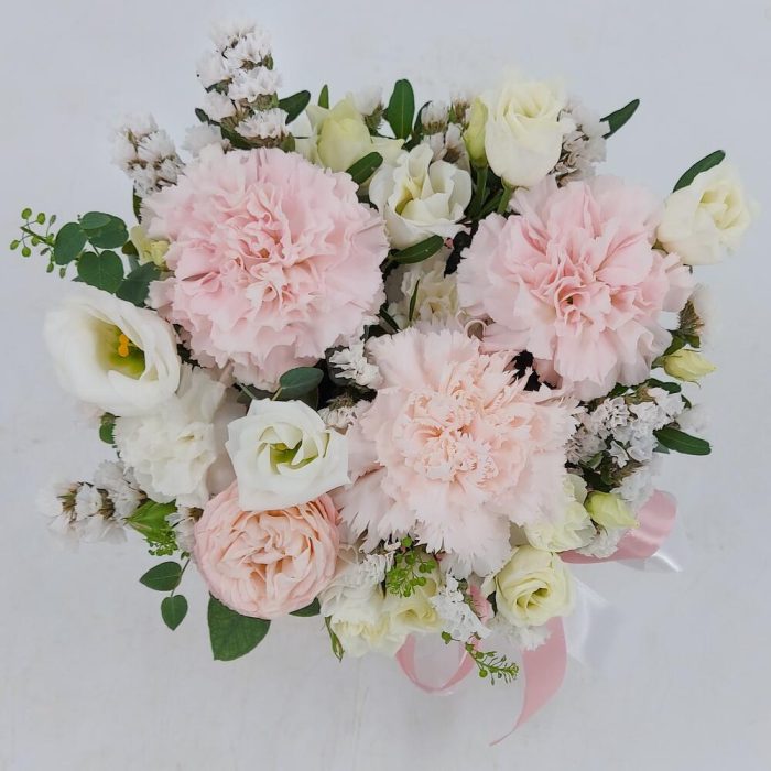 Роза кустовая – 1 шт.Статица – 1 шт.Эвкалипт – 1 шт.Эустома – 1 шт.Лента атласная – 2 шт.Пленка матовая – 1 шт.Флористическая губка (оазис) – 1 шт.гвоздика сортовая (диантус) – 3 шт.