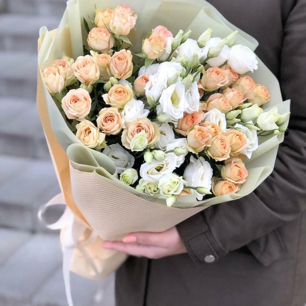 Лента – 1 шт.Роза кустовая – 5 шт.Упаковка – 4 шт.эустома белая – 6 шт.