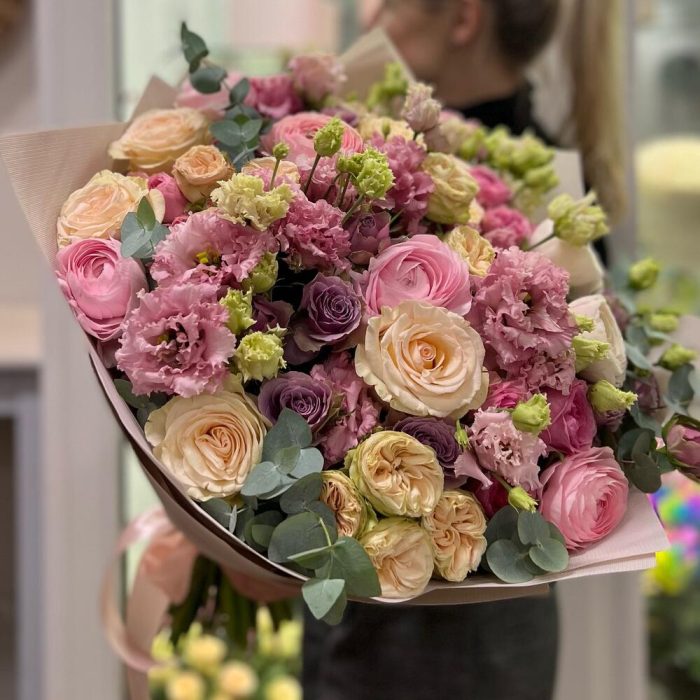 Ранункулюс клуни – 7 шт.кустовая садовая роза – 9 шт.садовая одноголовая роза – 7 шт.Лизиантус алиса – 7 шт.Эвкалипт – 1 шт.Дизайнерская упаковка – 1 шт.Открытка – 1 шт.