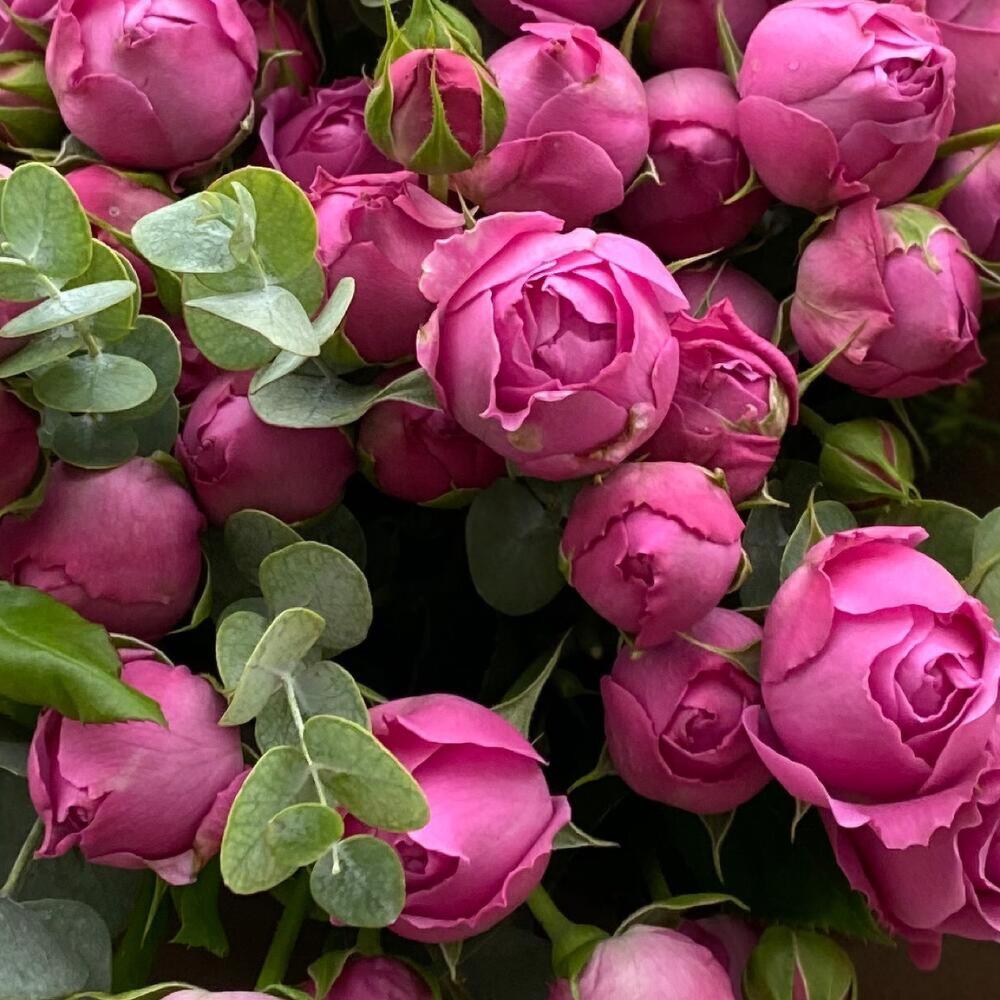 пионовидные розы Misty Bubbles – 11 шт. Эвкалипт – 3 шт. Крафт – 2 шт. Открыточка с вашими пожеланиями – 1 шт.