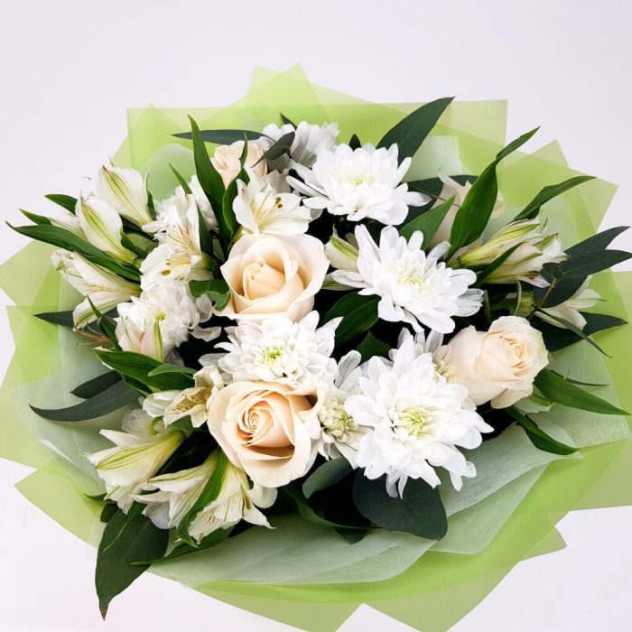 Роза одноголовая – 5 шт.Эвкалипт – 3 шт.Альстромерия – 3 шт.Хризантема Балтика – 3 шт.Упаковка – 1 шт.