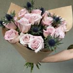 Крафт – 3 шт.Эрингиум синий – 3 шт.Роза розовая 50 см – 15 шт.