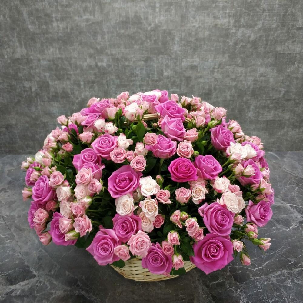 Корзина – 1 шт.Роза – 35 шт.Кустовая роза – 20 шт.Оазис – 3 шт.