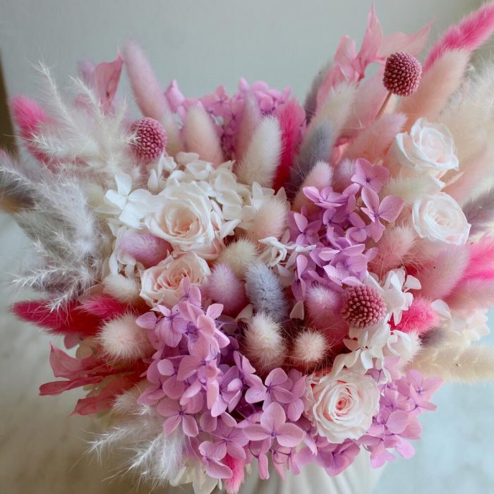 Роза одноголовая – 5 шт.Гортензия – 2 шт.пушистики – 1 шт.Керамическое кашпо – 1 шт.