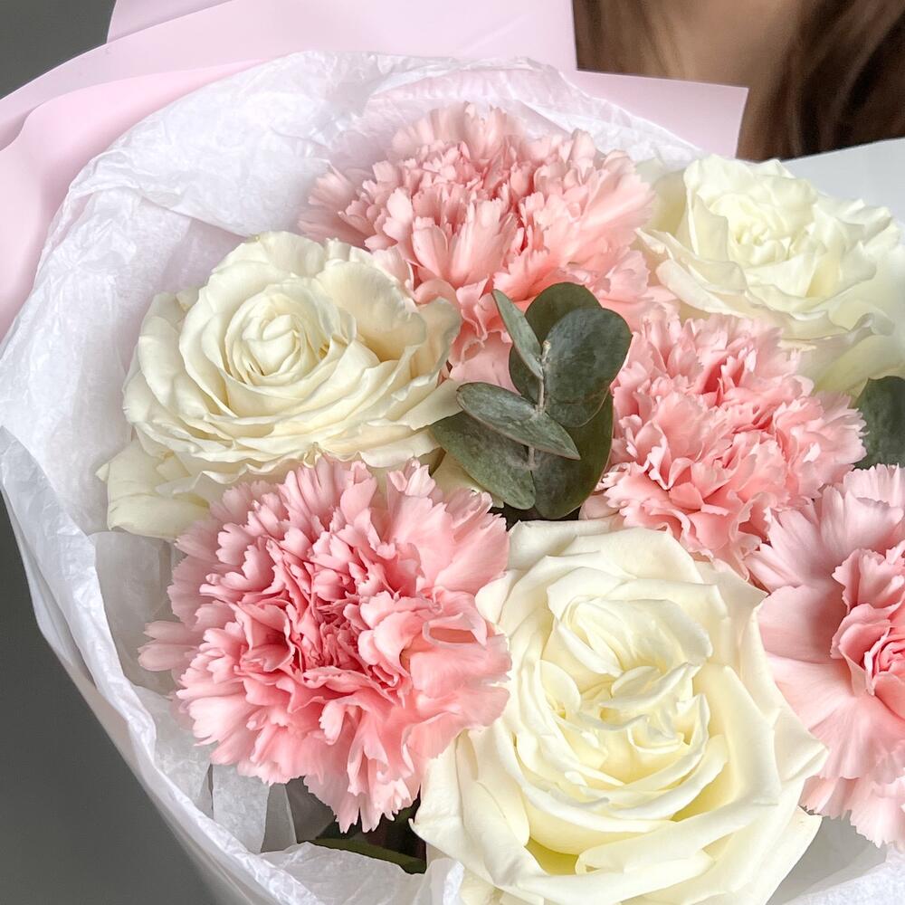Воздушный букет комплимент в нежных тонах. За счет стойкого состава, букет будет долго радовать своей красотой :)Все наши букеты доставляются упакованные и в воде!Не забудьте подрезать цветы перед тем как ставить в вазу (подрезали и в течении 2-3 секунд ставите в воду). Не храните букет на прямых солнечных лучах и возле отопительных приборов, чтобы сохранить цветы как можно дольше.Обратите внимание на фото в полный рост с человеком, для понимания размера композиции, это фото есть в карточке товара 🙂
