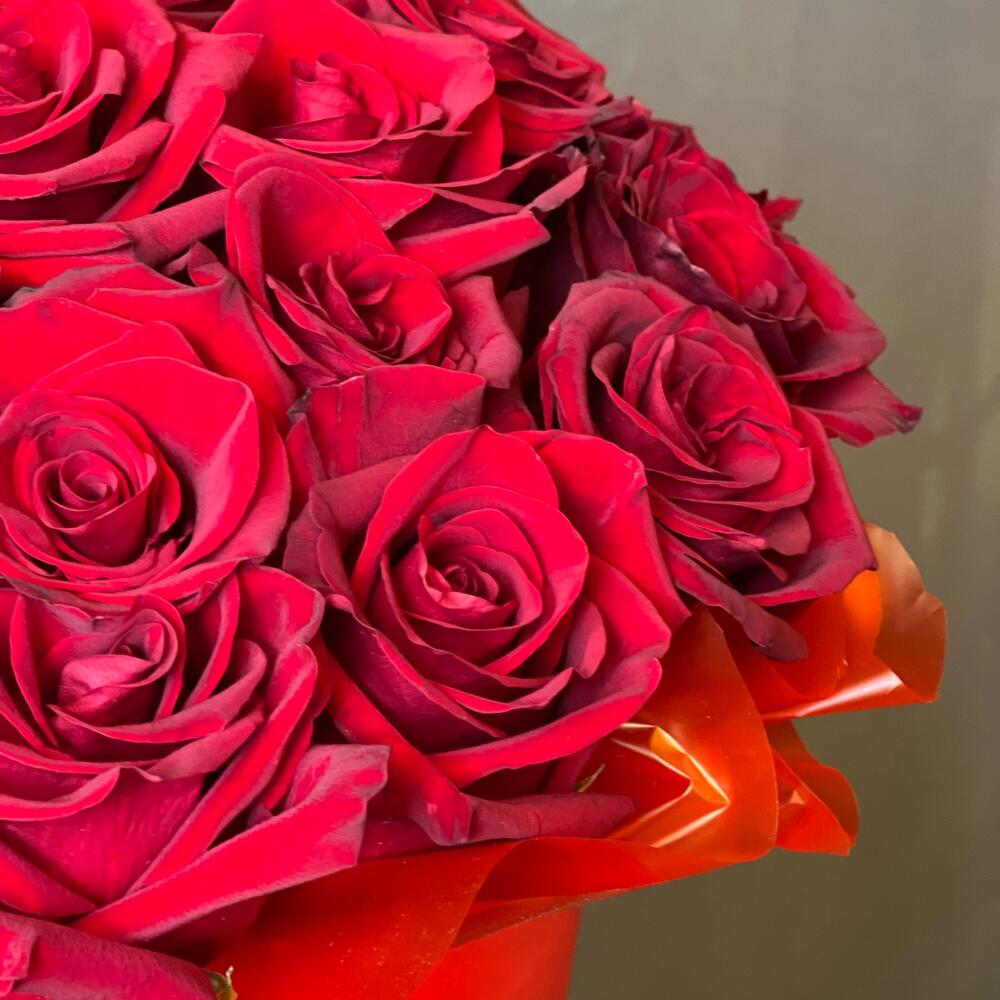 розы красные – 19 шт.Коробка шляпная – 1 шт.Оазис флористический – 1 шт.Пленка матовая – 1 шт.работа флориста – 1 шт.
