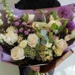 Сборный букет с розами, маттиолой, лизиантусом, эвкалиптом