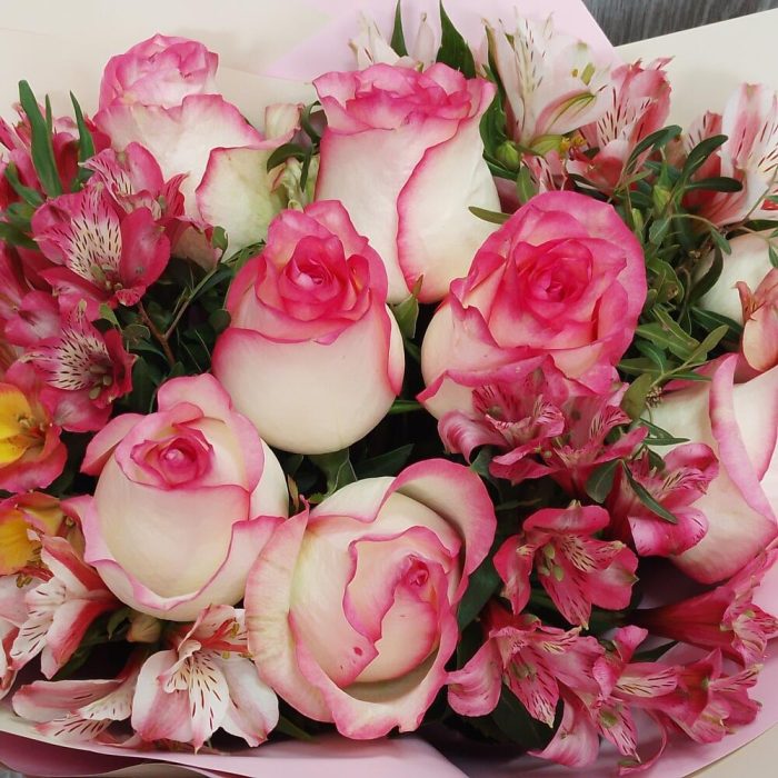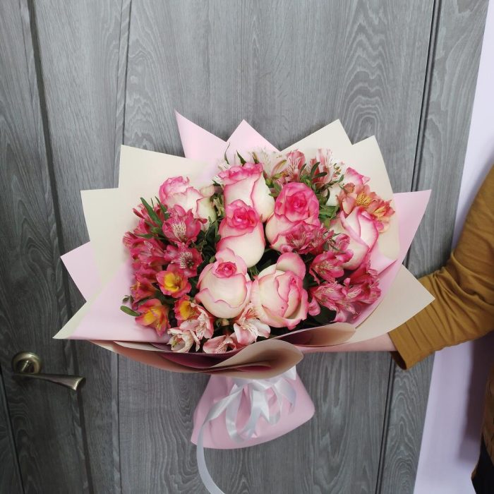 Альстромерия – 7 шт.Роза Джумилия – 7 шт.Фисташка пучок – 1 шт.Упаковка дизайнерская – 1 шт.Лента атласная – 1 шт.
