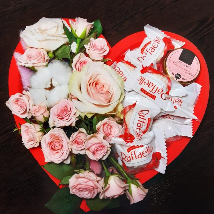 Красное сердце с нежной композицией из цветов с рафаэлло и мёдом -прекрасный подарок для девушек и женщин.Рафаэлло безусловно одна из самых желанных конфет на все времена.А свежие цветы для девушек и женщин -это всегда, радость и счастье.Побалуйте своих близких. ❤