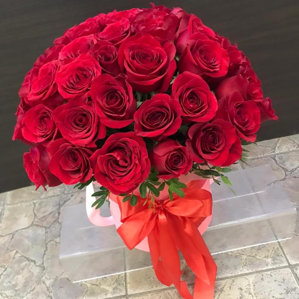 Роза Эквадор – 55 шт.Шляпная коробка с лентами – 1 шт.