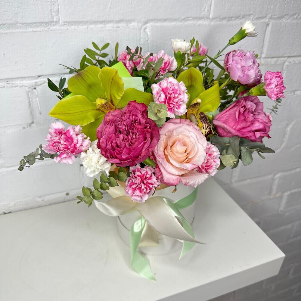 Роза Эквадор – 3 шт.Орхидея Цимбидиум – 2 шт.Диантус кустовой – 5 шт.Эвкалипт – 5 шт.Фисташка – 3 шт.Оазис флористический – 1 шт.Шляпная коробка – 1 шт.