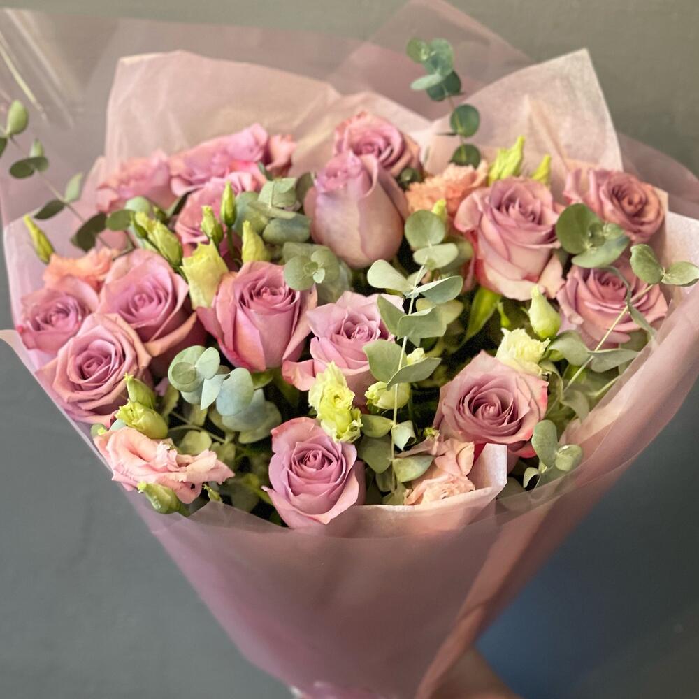 Красивый букет из сиреневых роз с эвкалиптом идеальный букет на любое торжество или просто так. Розы сорта дип вотер , сиреневые с ярким обрамлением , однозначно, произведут эффект вау и надолго останутся в памяти.Мы рекомендуем подрезать стебли ежедневно и менять воду , вазу мыть ежедневно , чтобы вода в цветах всегда была свежей. К букету вы можете выбрать открытку , топер, сладости , фрукты и ли напиток. Мы подпишем открытку и вовремя доставим адресату.