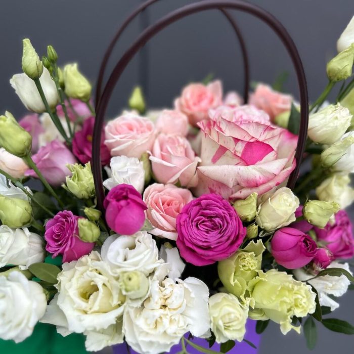 Коробка Трогательные чувства из эустомы и пионовидных роз