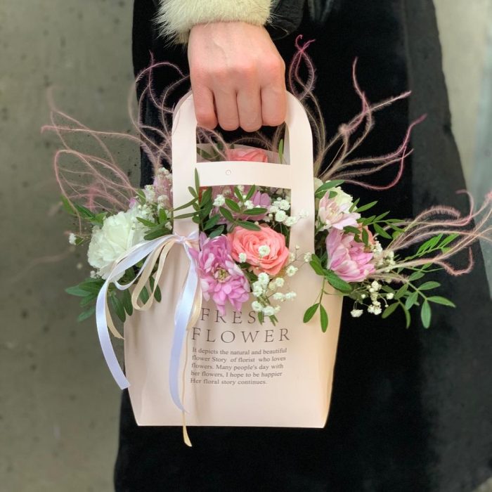 Сумочка – 1 шт.Роза кустовая – 1 шт.Хризантема кустовая – 1 шт.Гвоздика – 3 шт.Гипсофила – 1 шт.зелень декоративная – 1 шт.Сухоцветы – 1 шт.Оазис флористический – 1 шт.Лента атласная – 2 шт.