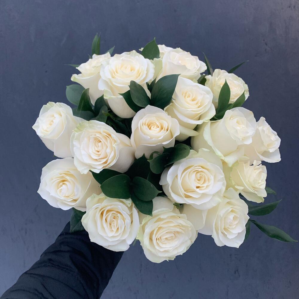Свадебный букет из белых роз и рускуса