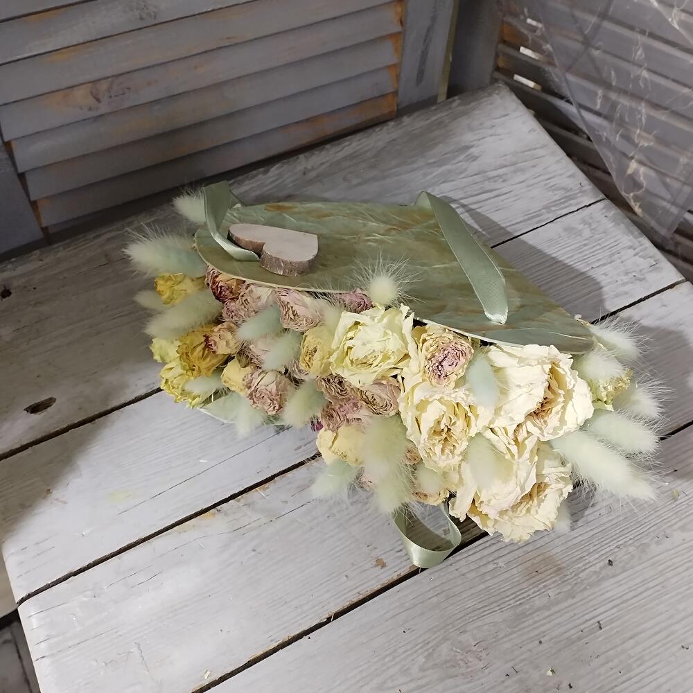 натуральная засушеная роза – 51 шт.Лагурус – 29 шт.каркас “сердце” из картона – 1 шт.