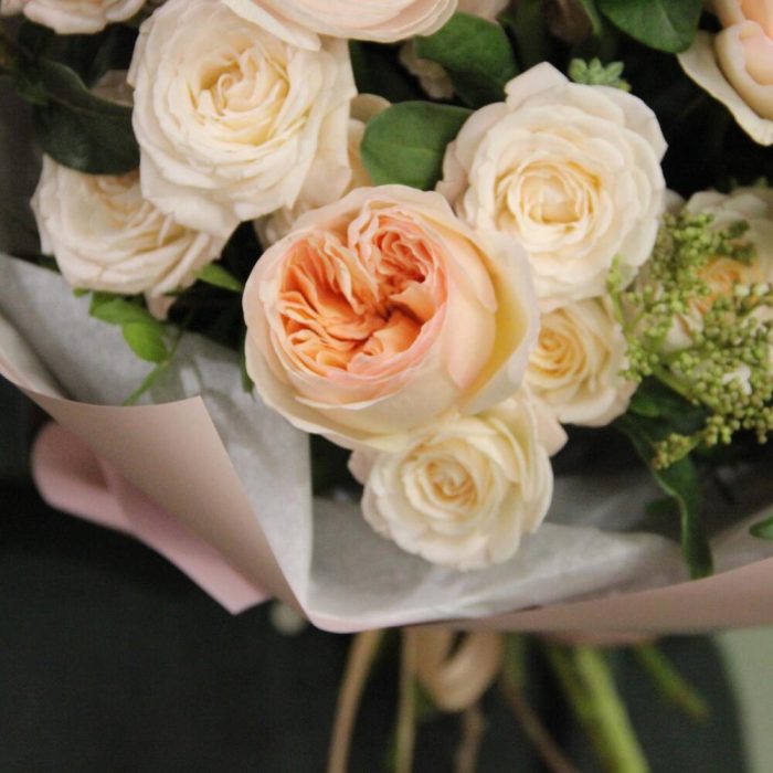 роза английская садовая – 3 шт.Ранункулюс – 3 шт.Роза кустовая пионовидная – 3 шт.Флокс – 2 шт.Маттиола – 3 шт.Вибурнум – 3 шт.Упаковка – 1 шт.