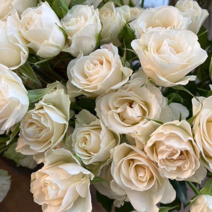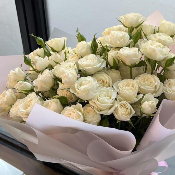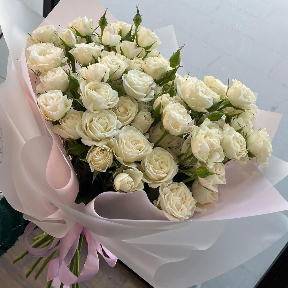 белые кустовые розы – 11 шт. Упаковка дизайнерская – 1 шт. Открыточка с вашими пожеланиями – 1 шт. инструкция по уходу за цветами – 1 шт.