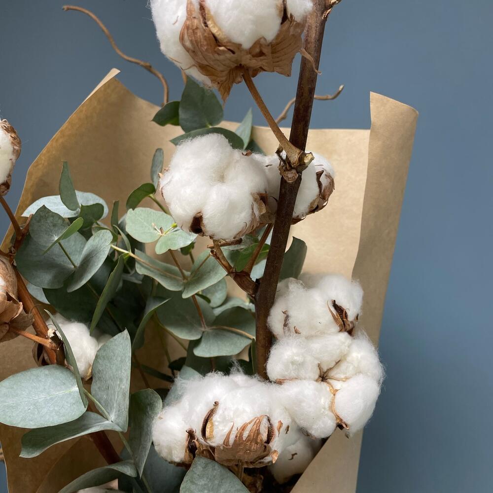 Хлопок (сухоцвет) – 2 шт.Эвкалипт – 4 шт.Упаковка дизайнерская – 1 шт.