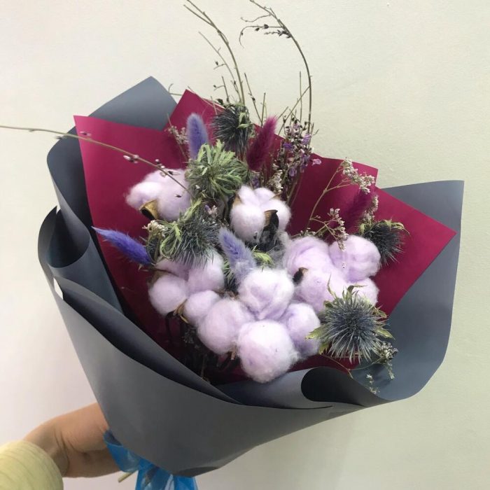 Хлопок – 5 шт.Чертополох – 7 шт.Лагурус – 4 шт.Лимониум – 1 шт.Авторская упаковка – 1 шт.Открыточка с вашими пожеланиями – 1 шт.