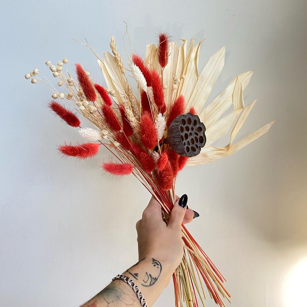 Лагурус – 30 шт.Фаларис – 4 шт.Колоски – 5 шт.лен сухоцвет – 10 шт.Лотос (коробочка) – 1 шт.Лист пальмы – 1 шт.