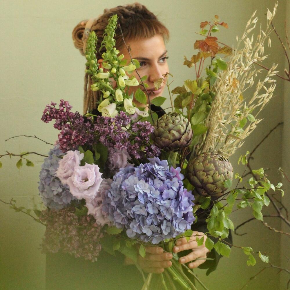 Черничный букет с гортензиями, артишоками, овсом, лизиантусом и наперстянкой.Стильное цветочное решение для любого случая.
