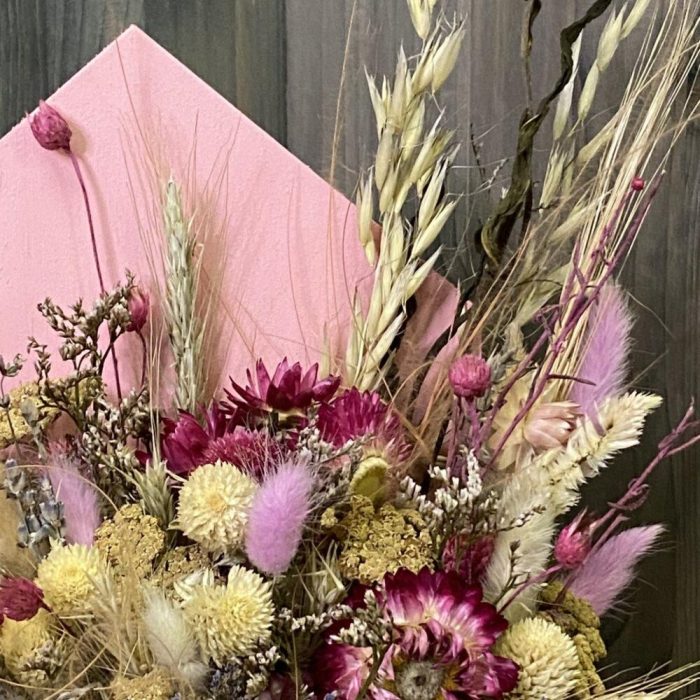 Конверт деревянный – 1 шт.Оазис для сухоцветов – 1 шт.Ковыль – 2 шт.овес сухоцвет – 2 шт.Рожь – 5 шт.Пшеница (сухоцвет) – 10 шт.Лагурус – 25 шт.Лаванда сухоцвет – 10 шт.прочие сухоцветы – 30 шт.