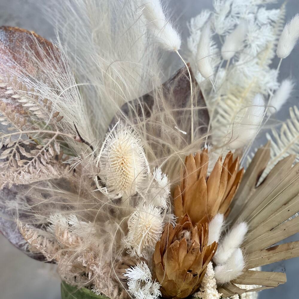 Коробка шляпная бархатная – 1 шт.протея сухоцвет – 2 шт.Лист магнолии – 1 шт.папоротник ветка – 1 шт.папоротник стабилизированный – 1 шт.эрингиум стабилизированный – 2 шт.лист пальмы сухоцвет – 1 шт.Ковыль – 3 шт.аспарагус стабилизированный – 1 шт.кортадерия ( бежевая ) – 2 шт.лагурусы (сухоцвет) – 10 шт.амарант стабилизированный – 1 шт.Оазис флористический – 1 шт.