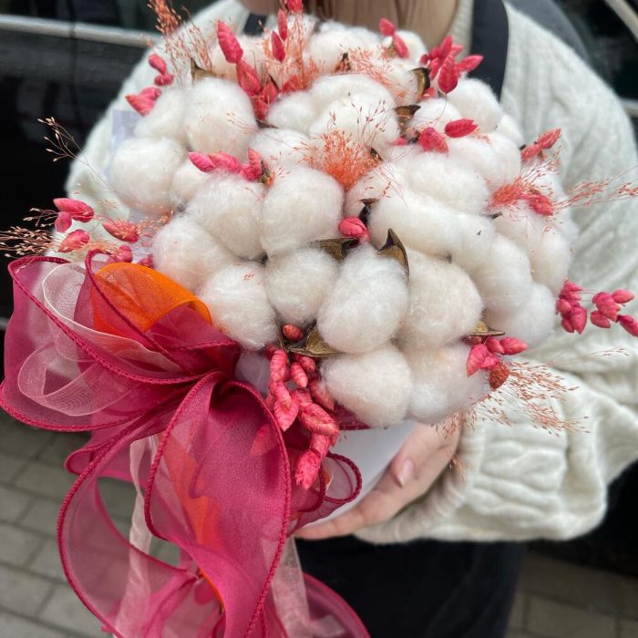 Яркая композиция из хлопка в коробке с сухоцветами идеально подойдёт в качестве подарка или для интерьера в доме .