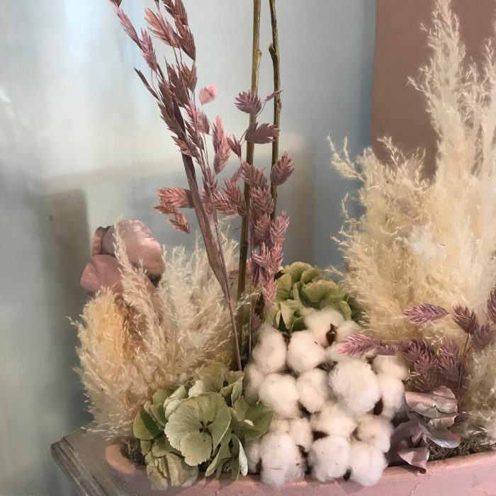 Кашпо керамическое – 1 шт.пена флористическая oasis – 1 шт.Гортензия – 2 шт.Хлопок – 5 шт.Эвкалипт – 1 шт.хасматиум – 4 шт.Мох стабилизированный – 1 шт.пампасная трава (сухоцвет) – 1 шт.