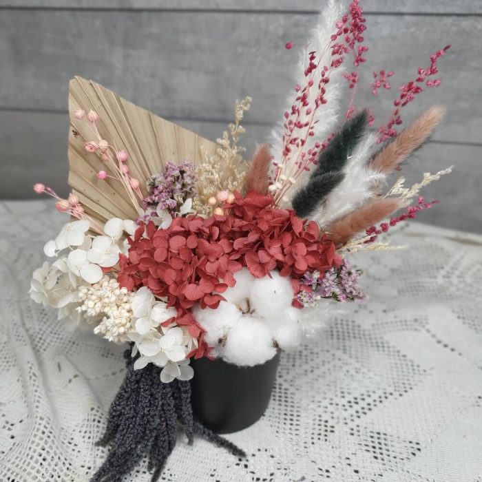 гортензия стабилизированная пучок – 2 шт.мини пампас – 2 шт.Лагурус (сухоцвет) – 5 шт.бриза пучок – 1 шт.Лен – 3 шт.амарант стабилизированный – 1 шт.копье пальмы – 1 шт.сорго – 1 шт.статица стабилизированная – 2 шт.Кермек – 2 шт.Хлопок натуральный – 1 шт.ботао – 6 шт.Кашпо керамическое – 1 шт.