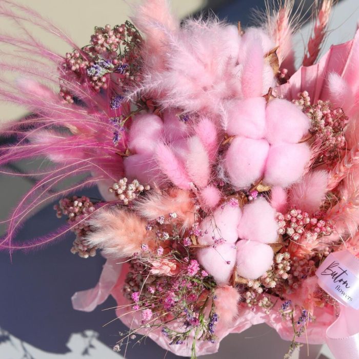Гипсофила – 1 шт.Озотамнус – 4 шт.Хлопок – 5 шт.Пальма – 1 шт.Колосья – 10 шт.Лагурус – 17 шт.Сетария – 2 шт.Кашпо керамическое – 1 шт.Открыточка с вашими пожеланиями – 1 шт.Шоколадка – 1 шт.Стифа – 1 шт.