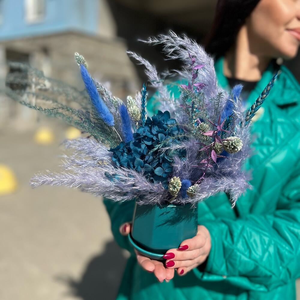 Композиция в керамическом кашпо с лагурусом,стабилизированной гортензией,мискантусом,кортадерией,пшеницей и фаларисом