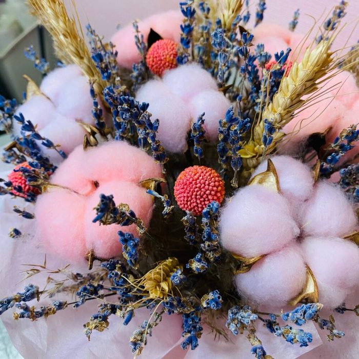 «Лавандовое созвездие» Букет из розы, гвоздики, статица и хлопка