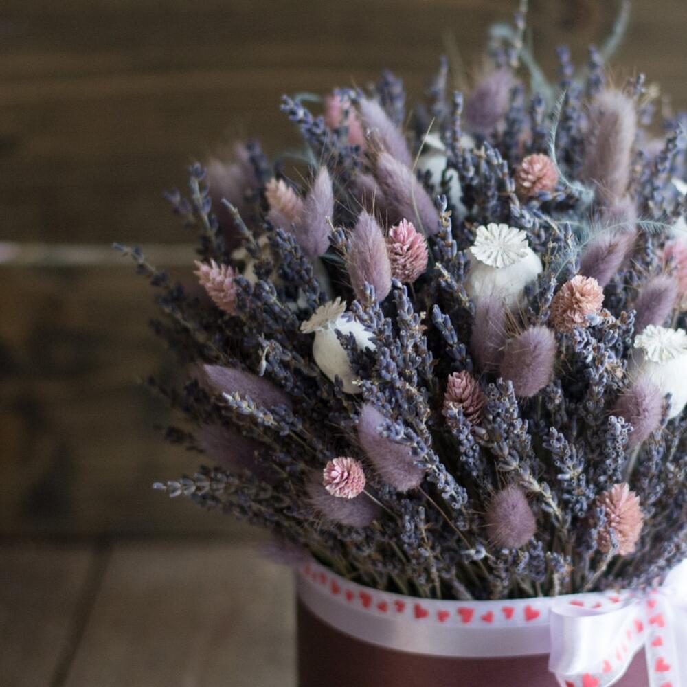 Лаванда (сухоцвет) – 159 шт.Лагурус (сухоцвет) – 30 шт.Шляпная коробка с лентой – 1 шт.Оазис флористический – 1 шт.