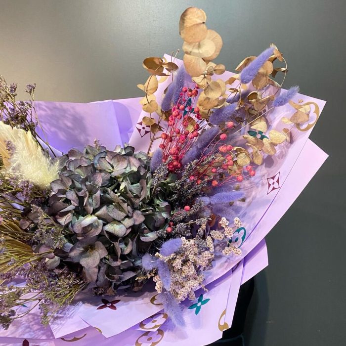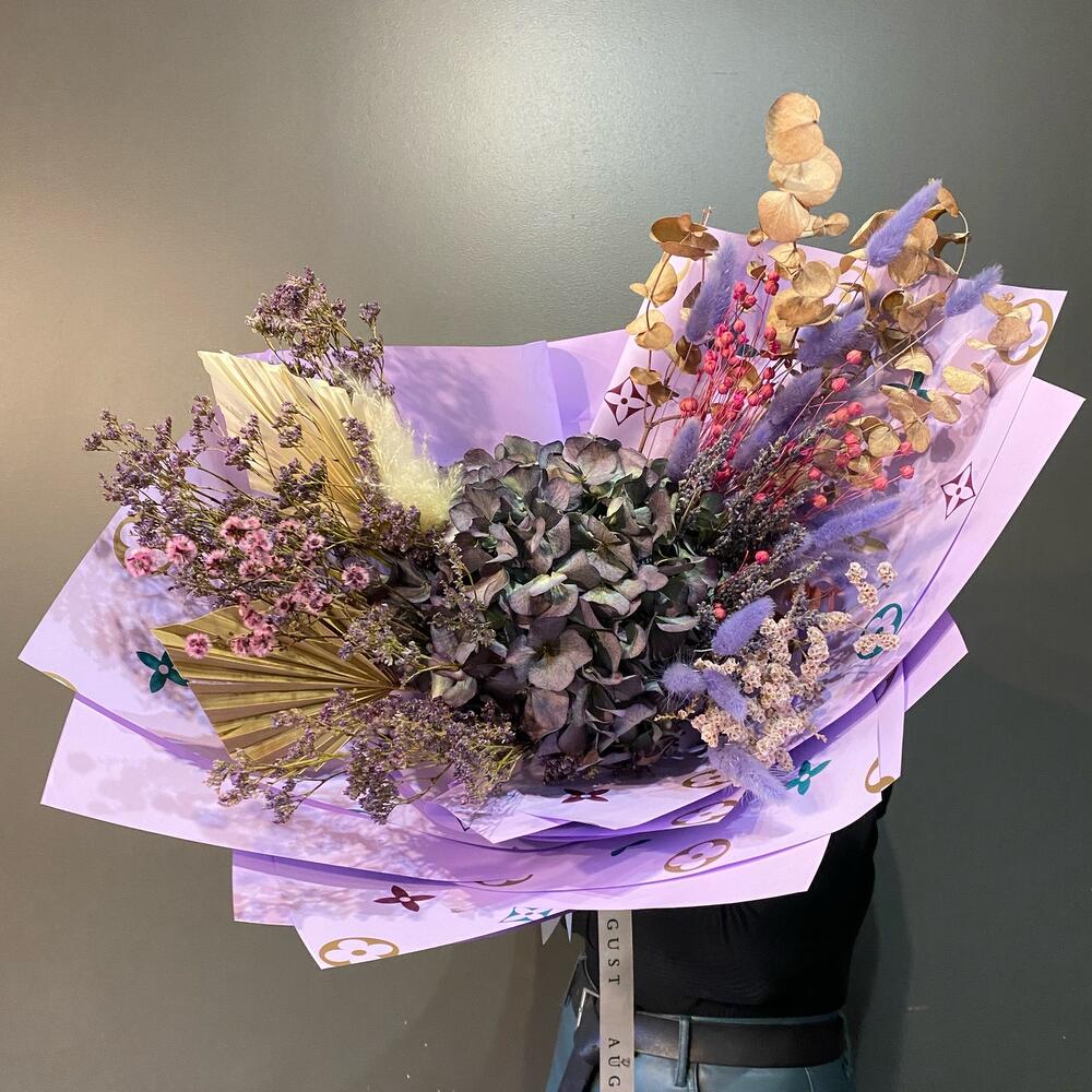 Гортензия – 1 шт.Лимониум – 4 шт.Лагурус – 20 шт.Лист пальмы – 2 шт.Эвкалипт – 2 шт.лен сухоцвет – 10 шт.пампасная трава – 1 шт.Лаванда (сухоцвет) – 20 шт.Пленка матовая – 5 шт.Лента атласная – 1 шт.