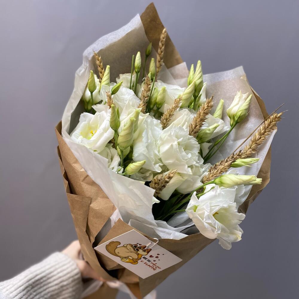 Лизиантус – 7 шт.Пшеница (сухоцвет) – 15 шт.Упаковка – 1 шт.Открытка мини – 1 шт.