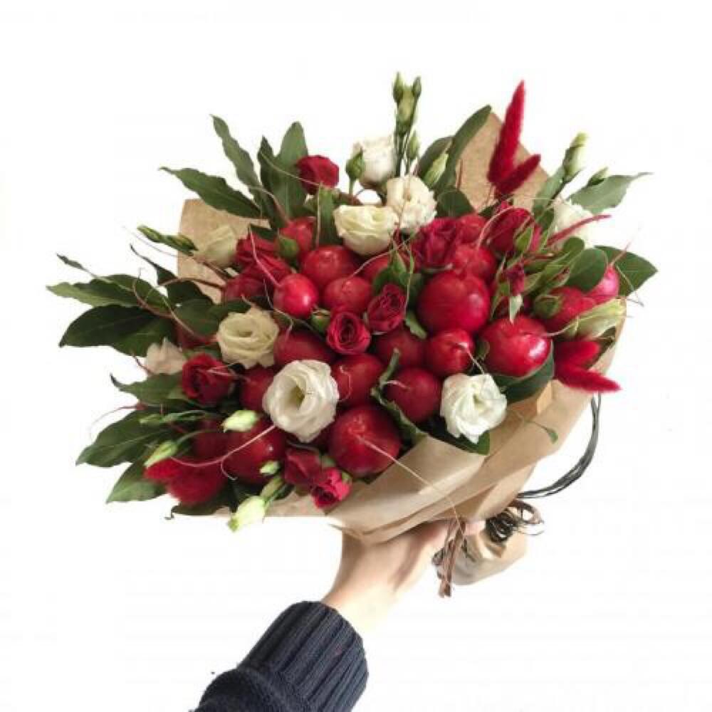 Редис – 32 шт.розы – 9 шт.Эустома – 10 шт.лавр или салал – 31 шт.Лагурус – 10 шт.