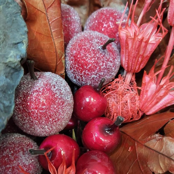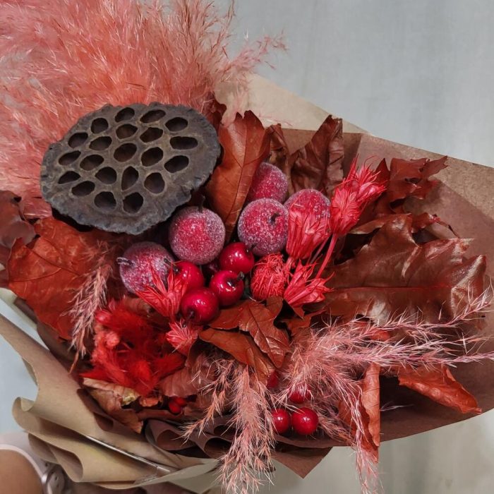 яблоко засахаренное декоративная – 6 шт.Лотос – 1 шт.пампасная трава – 1 шт.Листья Дуба – 2 шт.Лагурус – 11 шт.Буксус – 1 шт.ягоды искусственные – 2 шт.Упаковка крафт – 1 шт.