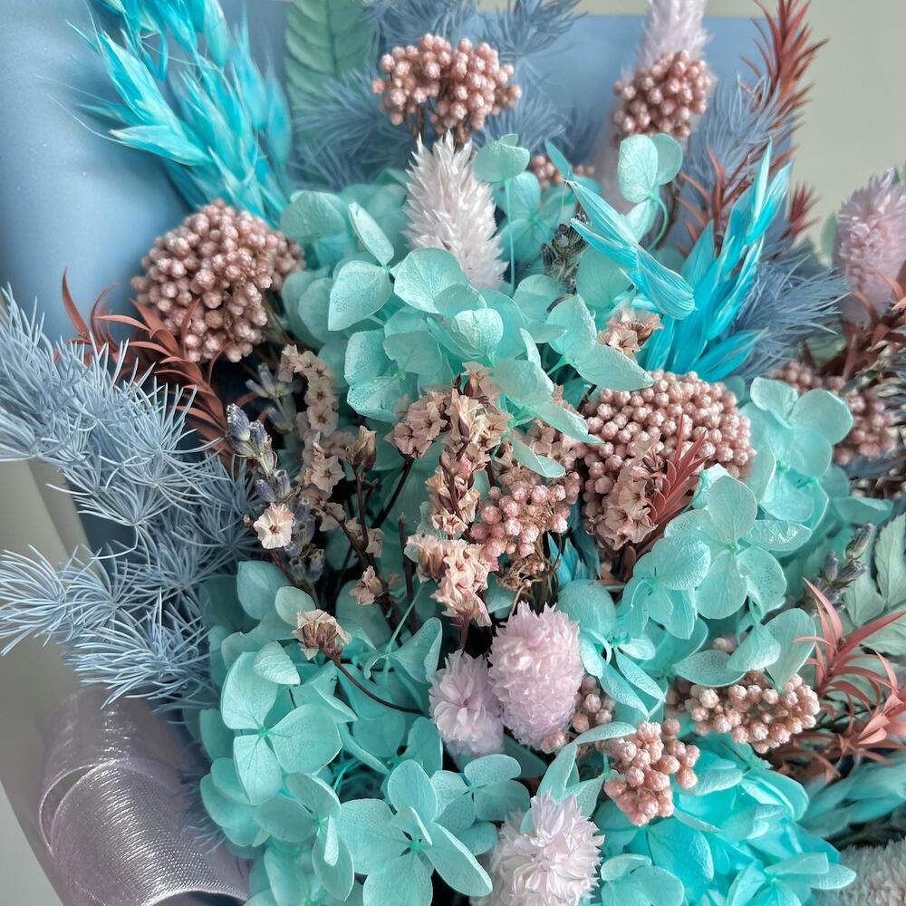 Озотамнус – 1 шт.Сухоцветы – 1 шт.Упаковка дизайнерская – 1 шт.Гортензия голубая – 1 шт.чайное дерево – 1 шт.