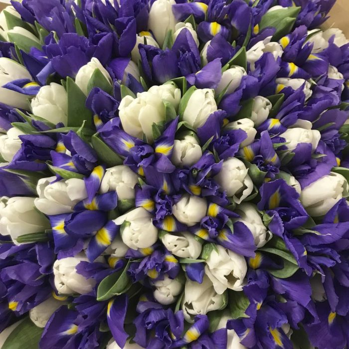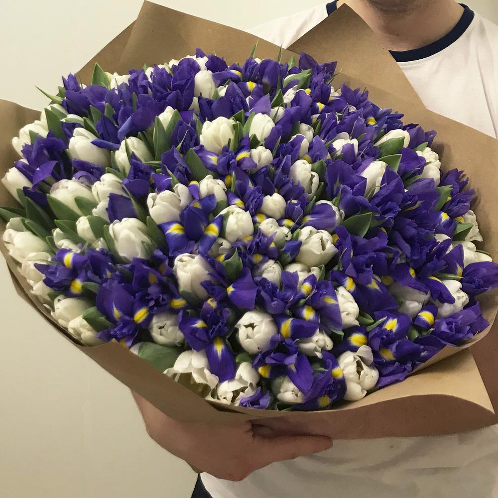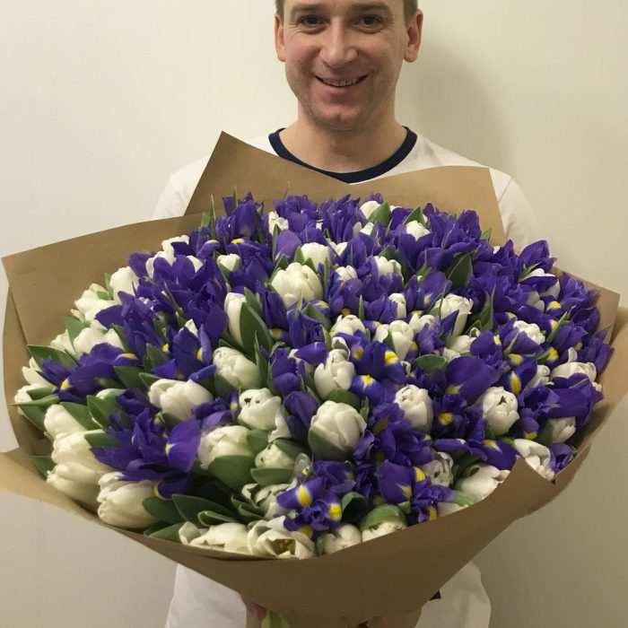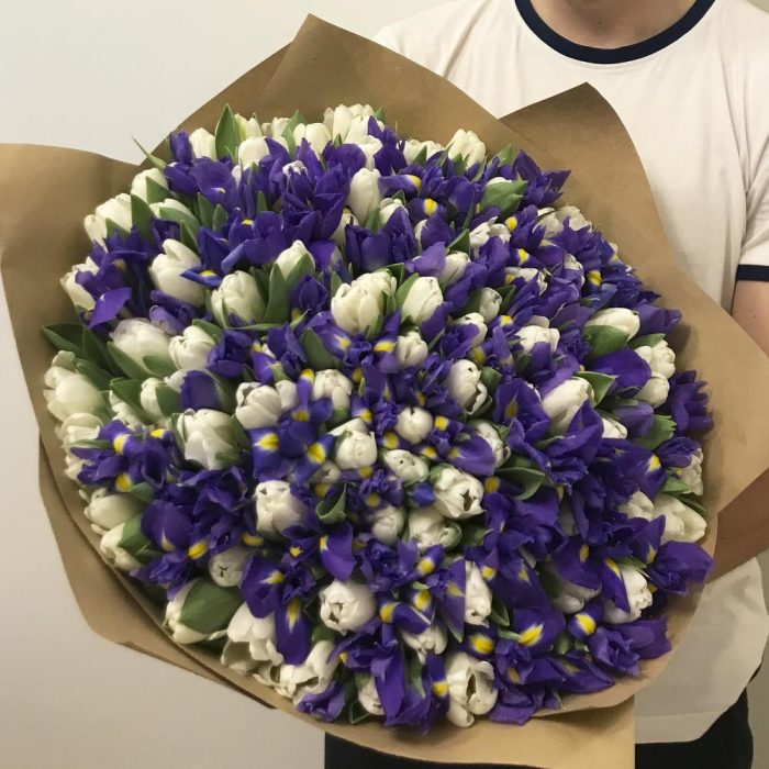 ирис премиум – 101 шт.тюльпан белый премиум – 100 шт.Подарочная упаковка – 1 шт.