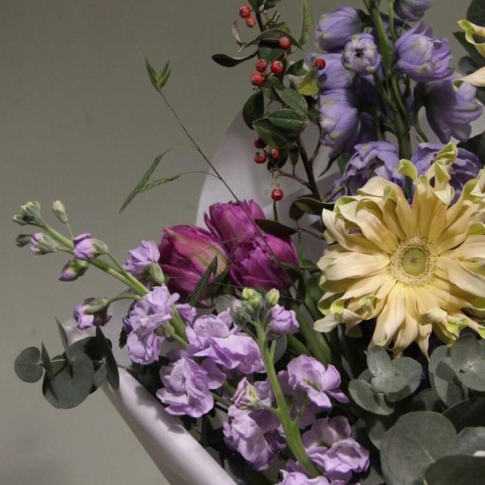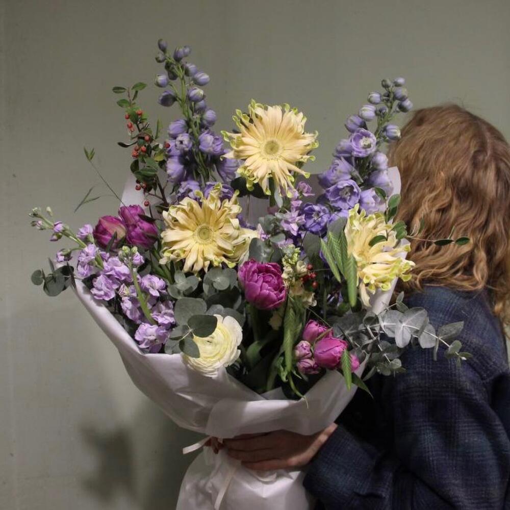 Дельфиниум – 2 шт.Тюльпан сортовой – 3 шт.Гербера – 3 шт.Ранункулюс – 1 шт.Маттиола – 4 шт.кизильник – 2 шт.кукушкины слезы – 2 шт.Эвкалипт – 5 шт.Упаковка – 1 шт.