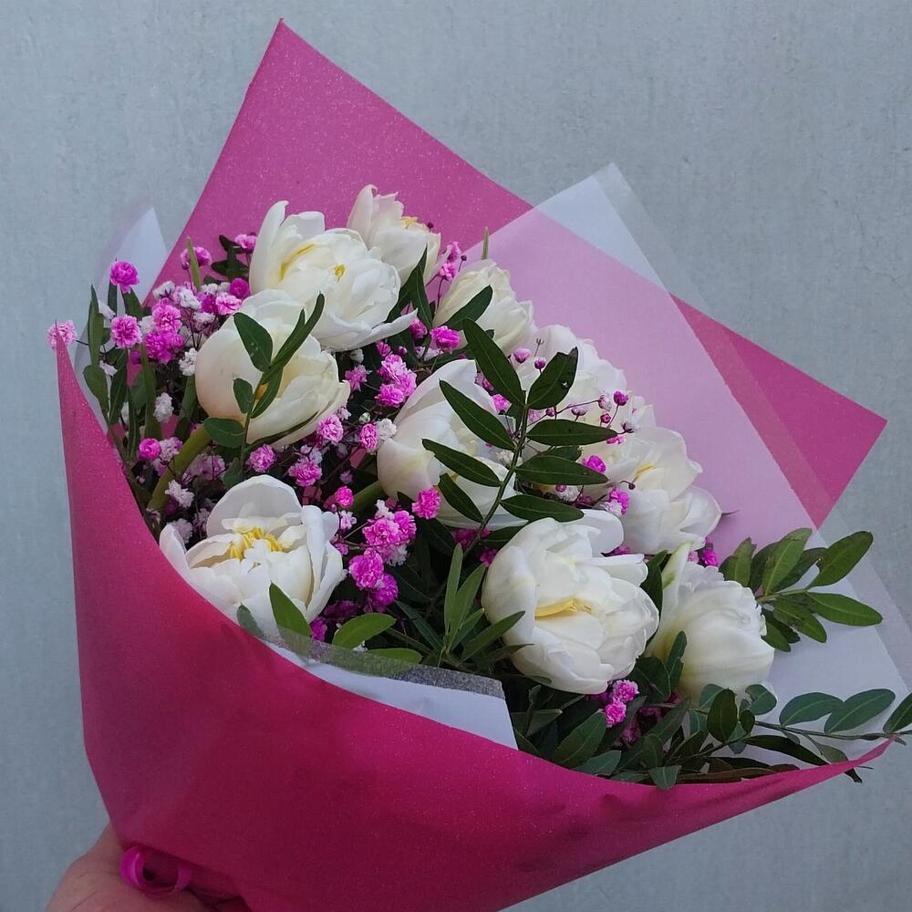 Лента атласная – 1 шт.Упаковка дизайнерская – 2 шт.Гипсофила розовая – 1 шт.тюльпан пионовидный белый – 11 шт.фисташка зелень – 5 шт.
