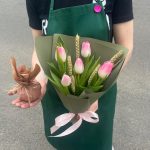 Крафт – 1 шт.Тюльпан розовый – 5 шт.Упаковка корейская пленка – 1 шт.Лента атласная нежно-розовая – 1 шт.бечевка натуральная – 1 шт.пшеница сухоцвет – 5 шт.