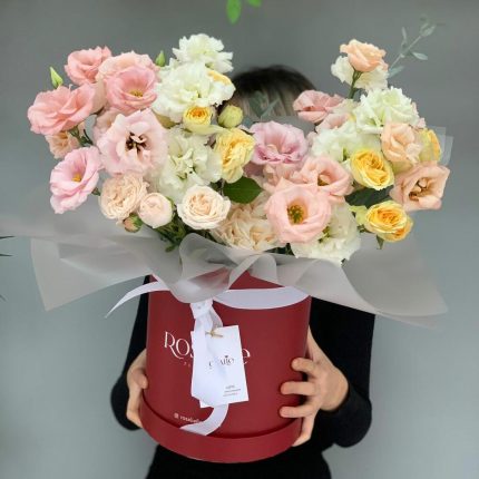 Пышный нежный и ароматный букет “Рассвет в любви” с розами, эвкалиптом, лизиантусом и генистой